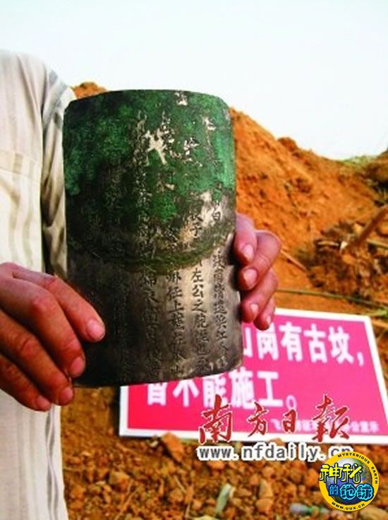 他拿出一块锈迹斑斑的青铜墓碑告诉记者,墓碑是在近日推平作业过程中挖掘出来的,与其一起出土的还有一件瓷器,但由于挖掘过程中钩机不慎将瓷器打烂,村民就将瓷器和青铜墓碑都拿回村中保存。