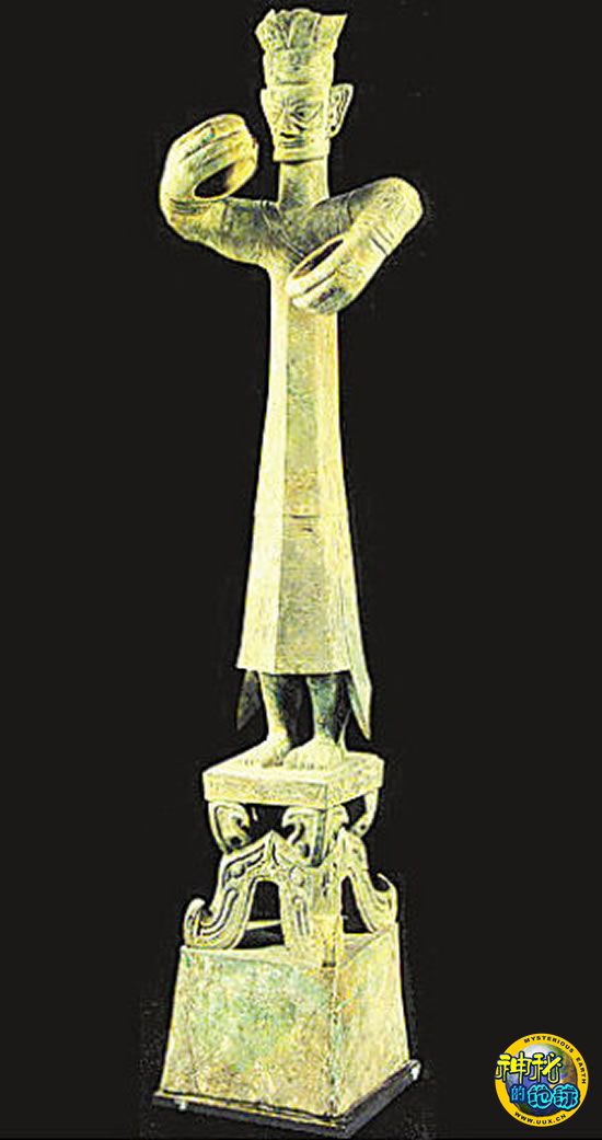 操持傩仪式的人无疑要借助最有威力的王者的形象驱鬼,因此,三星堆出土的青铜面具便大都是文献所记载的蚕丛的形象——纵目。而面具自然要夸张一些,故而,这些青铜面具的眉毛都高高地吊着,眼睛成柱状或锥状向外突出。
