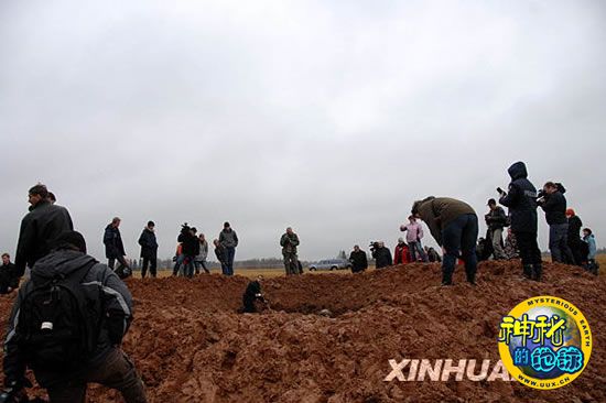 10月26日,在拉脱维亚东北部边境的马兹萨拉察镇(距首都里加约150公里),众多媒体人员观看并拍摄所谓陨石撞地球后留下的“陨石坑”。 新华社记者杨德洪摄
