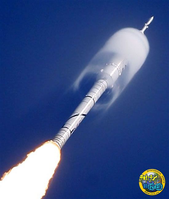 其实这个样子怪怪的罩子是一个蒸汽锥,类似于人造云。当纤细修长的“战神1-X”火箭速度达到1马赫,突破音障时就产生了这种现象。音障是一种物理现象,当物体(通常是航空器)的速度接近音速时,将会逐渐追上自己发出的声波。声波叠合累积的结果,会造成震波(Shock Wave)的产生,进而对飞行器的加速产生障碍,而这种因为音速造成提升速度的障碍称为音障。