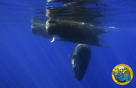 照片展示了5头成年抹香鲸正在教一只饥饿的小鲸如何捕捉猎物