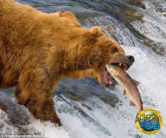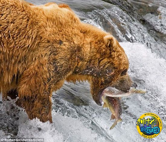 罗曼说,最有意思的时刻是一头灰熊妈妈领着3个孩子到来,当她抓到一条鱼,准备与孩子们分享时,一头雄性灰熊试图偷走这条鱼。