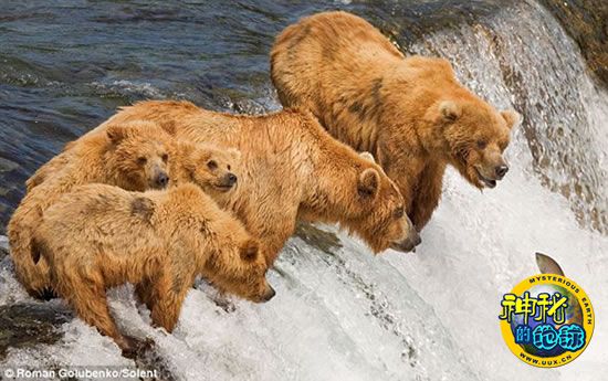 俗话说:“授之以鱼,不如授之以渔”。就连动物界的大灰熊,似乎也懂得这个道理。摄影师罗曼·古罗本科在美国阿拉斯加州卡特梅国家公园中,拍摄到一头母灰熊向它的3个孩子传授捕鱼技巧的场面。