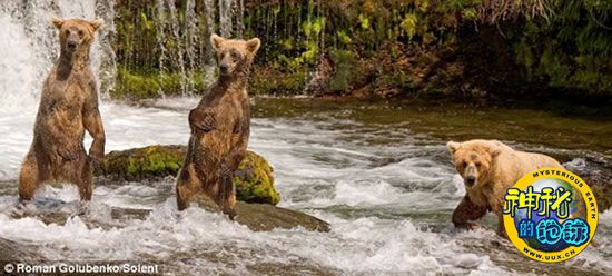 一些好奇的熊围在河边,直立着观看母熊大战入侵者。尽管灰熊并不是群居动物,但他们每年都会聚集在大马哈鱼产卵的溪流或者湖水边。尽管它们以凶猛著称,但却从不以人类为猎物,也尽量避免与人类接触。大多数熊袭击人,都出于保护后代或者食物的本能。