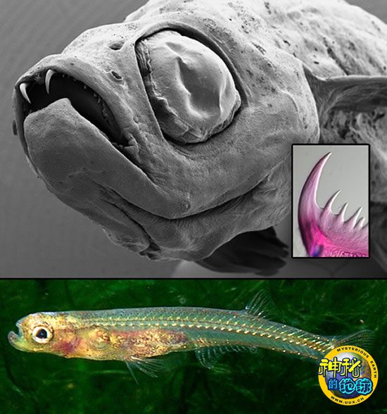 虽然这条雄鱼不会吸你的血,但却长着锋利的獠牙,为其赢得了“Danionella dracula”的学名,就像传说中的吸血鬼一样。“吸血鬼鱼”是2009年3月在缅甸发现的,它的獠牙其实并不是真牙。据研究人员介绍,这个外形恐怖的鱼种的祖先早在距今5000万年前便永远地失去了它们的牙齿。他们认为,雄性吸血鬼鱼利用这些超长牙齿在争斗中“恐吓”对方。