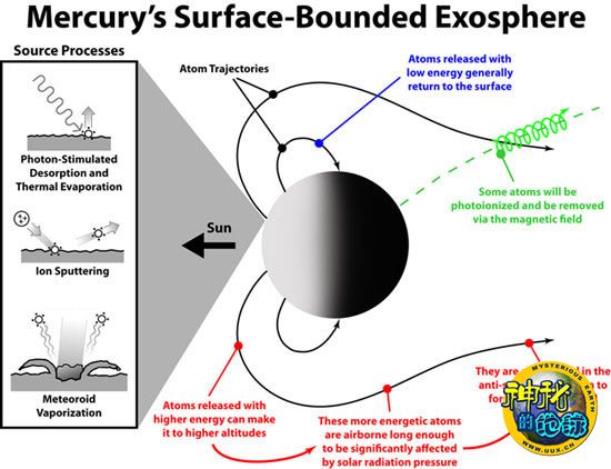 这是水星“外逸层”物质来源和丧失过程的图示。左边的说明概况了外逸层物质的3个主要来源