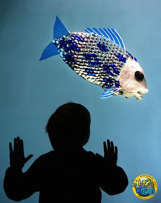 照片于2005年10月7日在伦敦水族馆拍摄,一名儿童正在饶有兴趣地观看一条好似宝石般的机器鱼。不久之后,5条类似的机器鱼将被部署到西班牙海岸,执行搜寻水中污染物的巡逻任务。