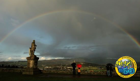 图片展示的就是业余金属探测迷布思发现地下黄金宝藏的地方。人们正抬头仰望发现地上空出现的景象