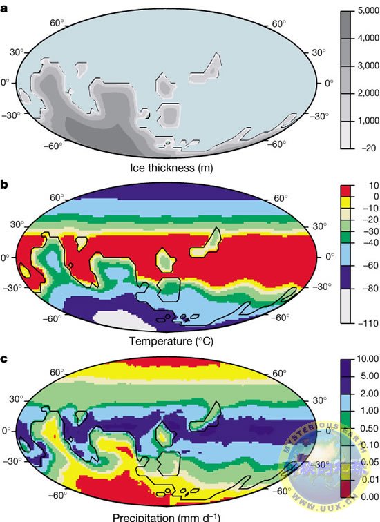 “雪球地球”假说提出,地球在“新远古纪III”(Neoproterozoic)期间是完全被冰覆盖的。人们曾提出另一种假说,即“融雪球”假说,该假说将允许赤道地区的海洋状态与其他地区的雪球状态共存的情形描述为“融雪球”,但这个问题仍然有争议。Peltier等人利用模型对碳周期与气候系统在“新远古纪III”期间的耦合演化进行了研究。他们发现,当表面温度下降时,大气中的氧被吸收进海洋中,加快了大量溶解的有机碳的重新矿化速度。这将导致大气中二氧化碳增加和温室变暖效应增强,使得一个完全的雪球状态不能形成。