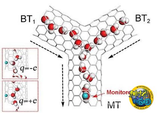 研究发现,当水分子受限于合适半径的Y型纳米碳管内时,管道内的水分子会“排成一列”,形成一维的水分子链,水在子管(BT)内的偶极取向可以由主管(MT)操控。当主管内水分子的偶极取向向下时,两个子管中的水分子的偶极取向也都向下;当主管内水分子的偶极取向向上时,每个子管中的水分子的偶极取向则具有相同概率的向上或向下;由此,实现了由子管中的水分子偶极取向来识别主管中单电子信号的诱导源。如果用管内的水分子偶极矩来判断,水在主管内的负偶极矩会导致子管的负偶极矩,而水在主管内的正偶极矩会导致每个子管的平均时间偶极矩趋向于零。这种水链表征的分子信号放大主要归功于水分子单链惊人强度的偶极诱导的有序性。这种信号的传递和放大能力在室温条件下是相当稳定的;并且信号对诱导电子的极性变化的响应相当快,延迟仅几十到几百纳秒。