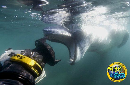 南极斑海豹是南极地区海洋中顶级食肉动物,相当危险。但是阿莫斯也是一位经验丰富、勇敢的水下野生动物摄影师。当阿莫斯将镜头伸到斑海豹面前时,斑海豹竟然主动、亲切地张开了大嘴,露出两排白森森的利齿。当然,这种可爱的形象并不能掩盖其食肉者的本质,阿莫斯接着又拍下了它捕食企鹅时的凶猛形象。