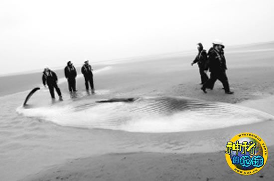 上海渔政有关人员来到横沙东滩检查搁浅的鲸鱼