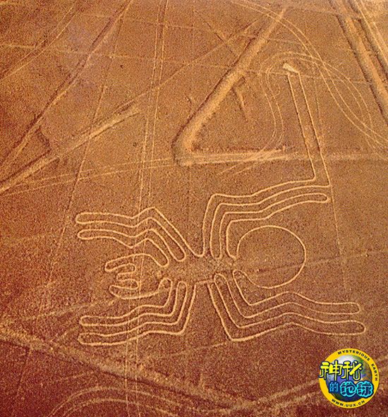 纳斯卡荒原上的巨画除了有无数笔直的宽广线条之外,更令人吃惊的是还有许多动植物图案,例如飞鸟、猴子、蜘蛛、不明植物,甚至鲸鱼等。在这些千奇百怪的图案中,人们发现了一幅惊人的图画,它不是模仿画,而是一只活灵活现的蜘蛛,这种蜘蛛只生活在亚马逊河流域偏远而没有人烟的潮湿森林里。蜘蛛大小只有几毫米,由于公蜘蛛在交尾过程中不能深入到母蜘蛛身子足够的深度,所以它们将爪子涂满精液,然后用爪子伸入母蜘蛛体内,而且每次交尾都是用的那只爪子。纳斯卡平原的画匠把这个细节也没有落下,将那只爪子画在一个小三角形里。
