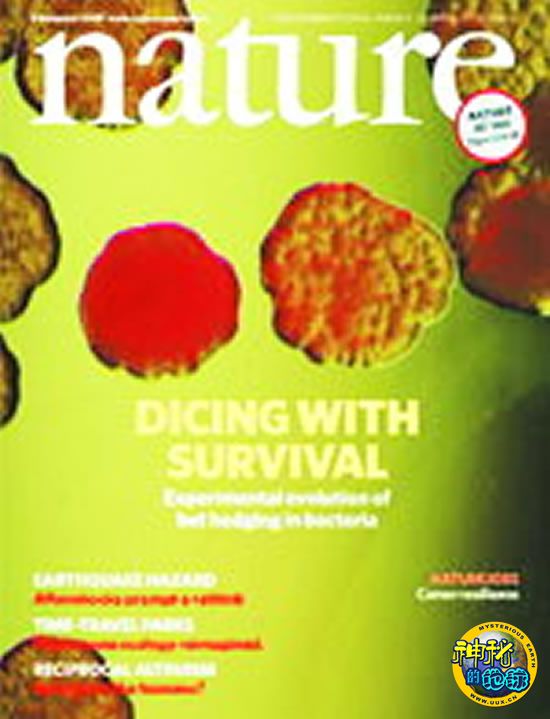 在自然界,表现型之间的随机切换(“风险对冲”)是生物在变幻无常的环境中求生存的常见现象。对暴露于一个与脊椎动物免疫系统等环境有相似性的波动体系中的“荧光假单孢菌”所作的一项研究,实时显示了这种行为何以能够发生。本期封面所示为一个“荧光假单孢菌”菌种的菌落,这个菌种已形成了在不同菌落类型之间随机切换的能力。这种“风险对冲”策略使它们能够在一个不断变化、以对不同菌落有利的人工环境中存活。“风险对冲”在实验室中的形成以及其中所涉及突变的识别,反映了动态环境是怎样推动这种“风险对冲”行为之形成的。