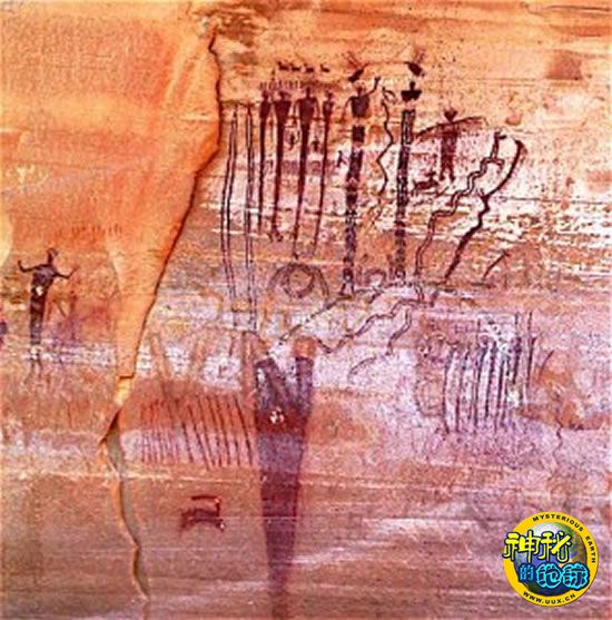 同样的岩画在澳大利亚中部的巨大岩石山--阿尔滋-洛克附近也可以找到。显然,这些奇异的人类以这个巨大的岩石山为目标,曾在这附近降落,使澳大利亚的先民们看到了他们的形象,并将之记录在岩石壁画中。