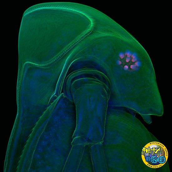 水蚤有像梳子一样的冠状物(头部位置绿色的尖刺状结构),看见它们,捕食者便没了胃口。尖刺冠状物直径约为200微米,出现于可感受鲎虫释放的化学信号的水蚤后代。德国基尔大学的詹·米歇尔斯(Jan Michels)利用共焦激光扫描显微技术制作出这张照片。该作品获得了2009年奥林巴斯国际生物数字显微摄影大赛的一等奖。令外骨骼绿色荧光褪色的染料和水蚤自身一些内部组织(包括变成蓝色和红色的复眼)的荧光暴露在显微镜的激光光线下,生成了这样一幅光彩陆离的景象。