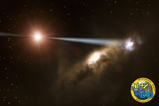 在这幅艺术想象图中,从黑洞(左)喷射而出的高能粒子束将附近星系的恒星点亮。两项根据欧洲南方天文台数据实施的最新研究表明,活跃的黑洞HE0450-2958通过“制服”附近的星系,引发快速的恒星形成过程,以此创建自己未来的家园。天文学家认为,多数质量很大的星系中央都有超大质量黑洞,虽然他们尚不确定星系和黑洞哪个最先出现。HE0450-2958黑洞没有自己的寄主星系。不过,这个黑洞的喷射物不断向附近的伴星系提供能量,该星系正以每年大约350个太阳的速度形成恒星,是普通星系形成恒星速度的100倍。天文学家认为,HE0450-2958黑洞最终会与附近的星系合二为一,创造一个成熟的星系,而黑洞就在其中央位置。