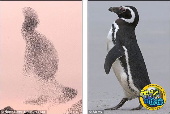 这张照片是菲奥娜·伊肯拍到的一群八哥组成的企鹅形象