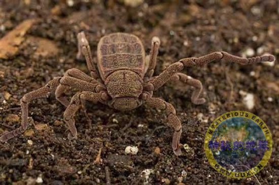 8、1种奇特的新型蜘蛛,其谱系可追溯至恐龙时代。这种蜘蛛有点像蜘蛛与螃蟹的杂交种类,雄性的生殖器官长在腿上。这种动物极其稀有,全世界已知的仅有57个物种。