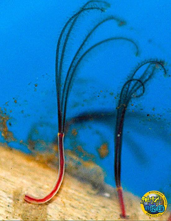 这是研究人员新发现的蠕虫之一,并根据羽毛状结构底部周围的黄色环形物,将其命名为Osedax黄领蠕虫。它们生活在水下3280英尺(约合 1000米)深处。科学家最早在2004年对Osedax蠕虫进行过描述。短短5年以后,又有几种以骨为食的新蠕虫出现了。迄今为止,科学家已经确认了5 种Osedax蠕虫。它们生活在太平洋和大西洋82英尺至9842英尺(约合25米至3000米)深处。今年11月,美国蒙特利湾水族馆研究所的研究人员又公布了12个潜在新物种的证据,其中就包括黄领蠕虫,它们都是在加利福尼亚州蒙特利附近的海底峡谷中发现的。