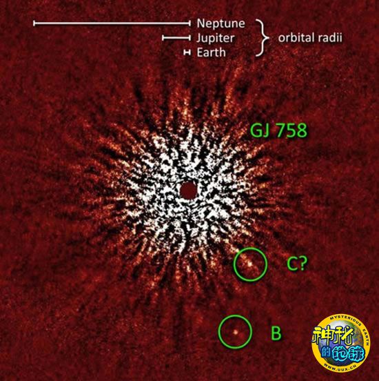 GJ 758 B(圆圈B)的近红外直接图像,由昴星望远镜的HiCIAO拍摄。圆圈B上方的圆圈C是一颗身份尚未证实的天体,可能是一颗行星