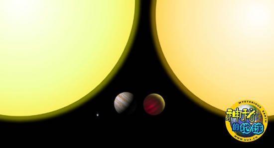 体积对比图,从左至右分别是太阳、地球、木星、GJ 758 B以及所绕恒星GJ 758。类行星天体GJ 758 B温度达到600华氏度,所发光线呈樱桃红色。