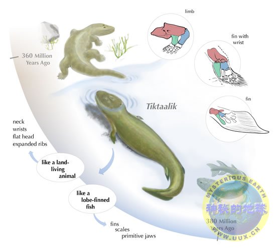 从水中向陆地的演化转变是人们一直都感兴趣的问题,最近与这种转变有关的过渡性化石在加拿大的发现以及将以前被划分为鱼类的化石重新解释为四足动物(或近似于四足动物的动物)的研究结果,进一步激发了人们的这种兴趣。但陆地生命的历史还要更为久远一些。来自澳大利亚泥盆纪地层的、距今已有3.8亿年但却保存极为完好的格格纳瑟斯鱼(Gogonasus)的化石,在很多方面都像鱼,但其耳和鳍却出乎意料地发达。所以,四足动物耳和四肢骨架的一些特征现在可以从鱼类那里找到根源了。