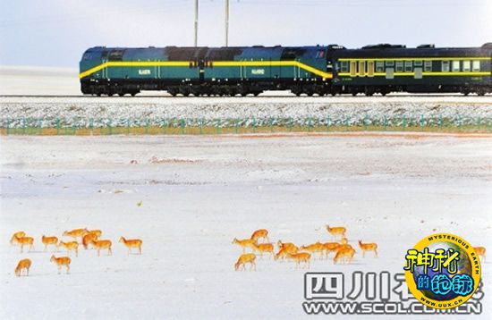 2009年6月5日,迁徙途中的母藏羚羊在青藏铁路边悠闲地吃草