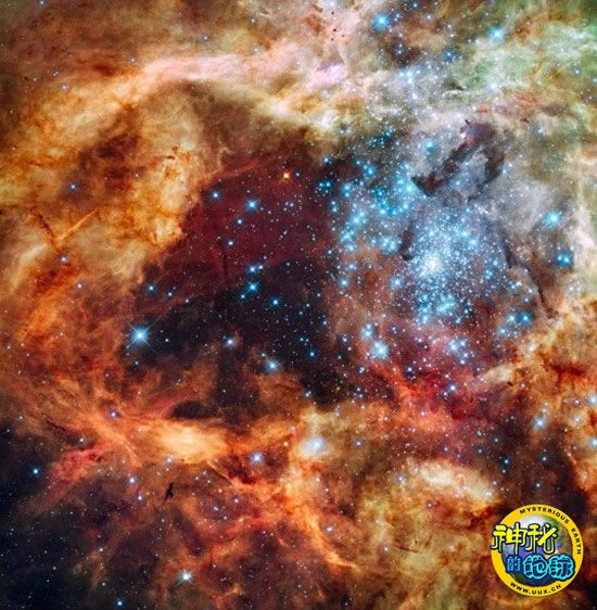 图片中的很多年轻炽热恒星体积巨大,其中一些的质量是太阳的100多倍。这些能量巨大的恒星一直向外喷射紫外线流和带电粒子流,也就是恒星风,并在外围氢气云中冲击出深洞。值得一提的是,出生、死亡和再生过程一直上演。当遭遇密集的气壁时,恒星风便会产生冲击波,帮助触发新一轮恒星诞生潮。与此同时,体积较大的前身星相对更快地走完自己的一生,最终以超新星爆炸的方式结束生命,就像是一串鞭炮。