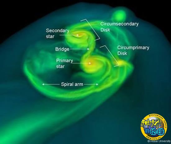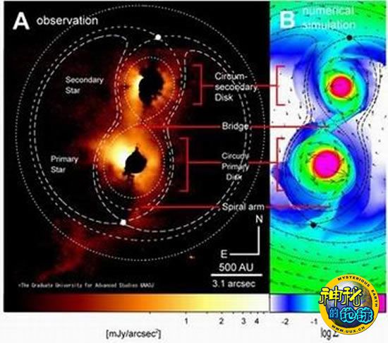 日本千叶大学天文学家Tomoyuki Hanawa博士和日本法政大学Tomoaki Matsumoto博士分析了这两个年轻恒星的属性数据,他们使用超级计算机实现了图像所表现的产生恒星结构的圆双重恒星盘增长的二维数值模拟。通过观测数据和模拟数据的对比,他们发现沿着螺旋臂存在着新鲜的宇宙物质流,通过与圆双重恒星盘相连接的“气体桥”向圆主恒星盘提供新鲜的宇宙能量物质。