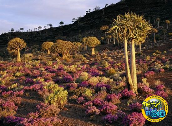 照片摄于南非,展示了科克布姆树(也被称之为“箭树”)及其周围粉红色的花。这种沙漠植物高度最高可达到32英尺(约合10米),名字来源于纳马跨兰的本土San猎人,他们将树枝砍下来制成箭,箭头上还要涂上毒药。