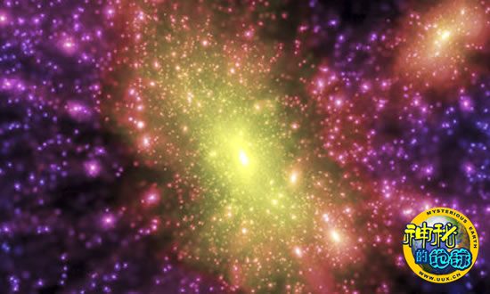 关于暗物质的电脑模拟图。该图演示了不可见暗物质是如何在光环中结合的。
