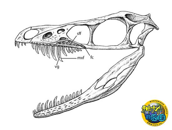 在最新研究中,研究人员在中国鸟龙化石身上发现了一个令他们十分感兴趣的袋状结构(可能是毒腺),并且经由长长的凹槽与毒牙底部相连,凹槽中或许隐藏着毒液管。中国鸟龙的尖牙表面也具有像毒蛇一样的凹槽。