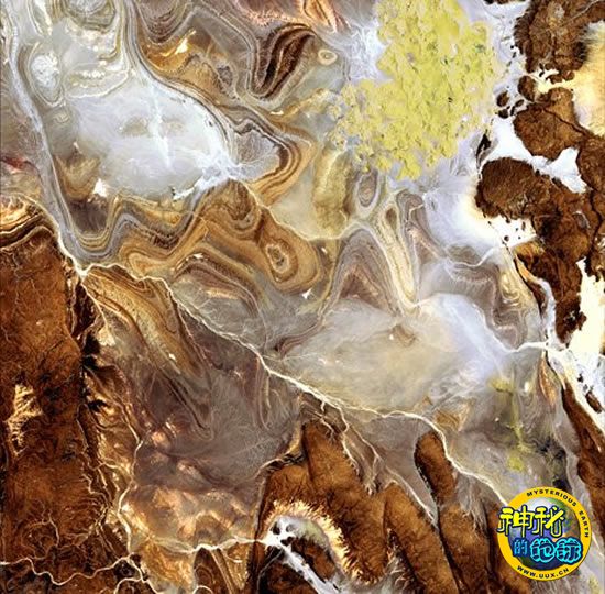从欧洲航天局10月公布的这张照片上看,塔奈兹鲁夫特(Tanezrouft)盆地上的白色盐碱地似乎融化了黑色砂岩山。欧洲航天局与日本合作,6月利用日本的先进陆地观测卫星拍到这张图片,它采用的一种仪器从可见光和近红外线范围内记录了这一地区陆地和植被的覆盖情况。位于阿尔及利亚中南部的塔奈兹鲁夫特盆地是撒哈拉沙漠中一处最荒凉的地方,有时这里被称作“恐怖之地(land of terror)”。右上侧的黄色带状物是Erg Mehedjibat区域,它由一群小型星状沙丘组成,这些沙丘向上生长,而非并列生长。