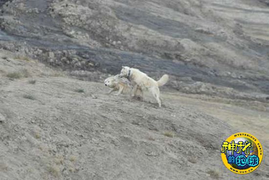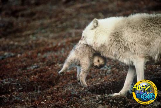 一匹母狼正在衔着狼崽走回狼穴