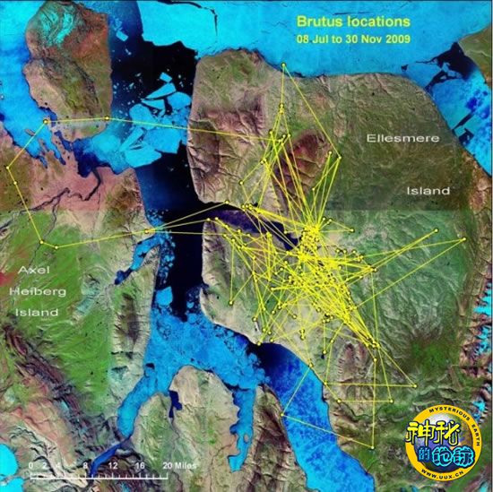 美国地质勘探局科学家近期利用卫星跟踪项圈技术对一匹北极狼在北极地区的活动进行了跟踪研究。这匹狼名叫“布鲁图斯”,它的颈部被研究人员套上了一个卫星跟踪项圈。研究人员利用全球卫星定位系统及时跟踪布鲁图斯的行踪,最终绘制出布鲁图斯所在狼群近段时期的活动轨迹图。美国地质勘探局同时在官网上公布了关于该狼群活动的精彩图片。