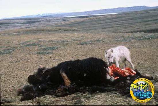 布鲁图斯正在撕咬麝牛的尸体。在埃尔斯米尔岛上,麝牛是北极狼的主要捕食对象