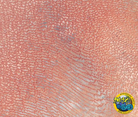 这片沙漠是世界上面积最大的沙海,占地面积达到22.5万平方英里(约合58.2平方公里)。第一幅照片展示的区域虽位于沙特阿拉伯,但沙漠内的沙子也会流向也门、阿曼以及阿拉伯联合酋长国部分地区。粉红色沙丘之间的灰白色区域是干盐滩。