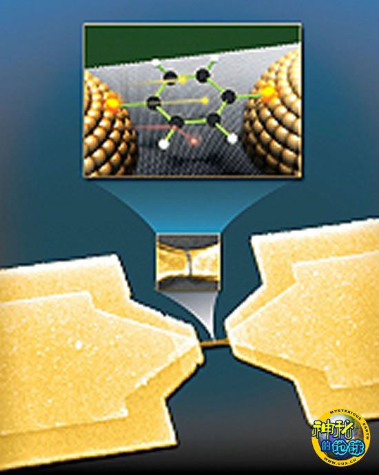 研究人员说,苯分子在附着到黄金触点上后,就可以发挥硅晶体管一样的作用。研究人员能够利用通过触点施加在苯分子上的电压,操纵苯分子的不同能态,进而控制流经该分子的电流。