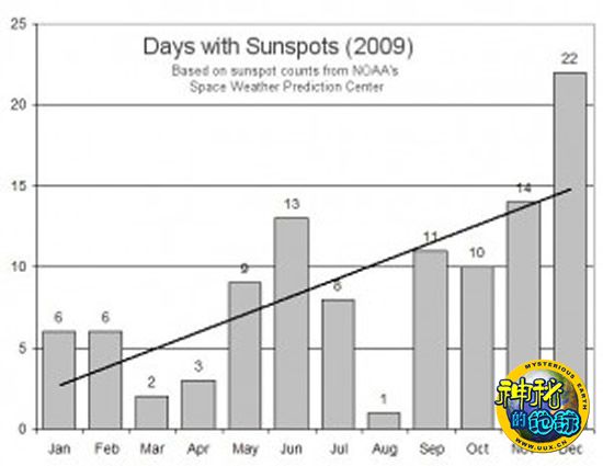 太阳黑子的观测数据显示,2009年是太阳黑子活动低值期,260天没有太阳黑子出现。但是,在2009年12月的31天中有22天出现了太阳黑子,预示着太阳将进入一个新的活动周期。