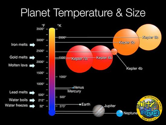 美宇航局估计,这5颗行星的温度都要比岩浆高,可以将金子熔化。据“开普勒”任务首席科学家威廉姆-博鲁奇(William Borucki)在华盛顿举行的美国天文学会年会的新闻发布会上介绍,5颗行星分别被命名为“开普勒4b”、“开普勒5b”、“开普勒6b”、“开普勒7b”、“开普勒8b”,温度从2000华氏度到3000华氏度(约合1090摄氏度至1650摄氏度)不等。
