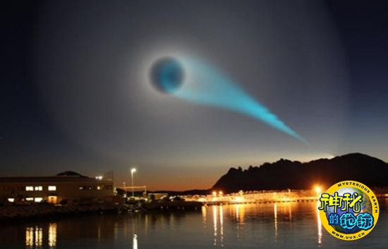 12月9日,挪威北部地区上空突然出现一个怪异的蓝色光圈。神秘光圈呈旋涡状,从旋涡中心射出青绿色的光束。这一奇怪的现象引发了人们的种种猜测,如UFO、极光以及测试导弹等。后经证实,它是由俄罗斯位于白海的核潜艇发射导弹所致。本图由摄影师简-彼德-乔根森所拍摄,当时他正在前往工厂的路上。