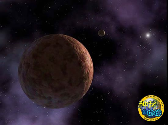 这是太阳系矮行星“塞娜”的艺术绘图,最远端是太阳,在太阳和塞娜之间是一个有待证实的地球大小的卫星