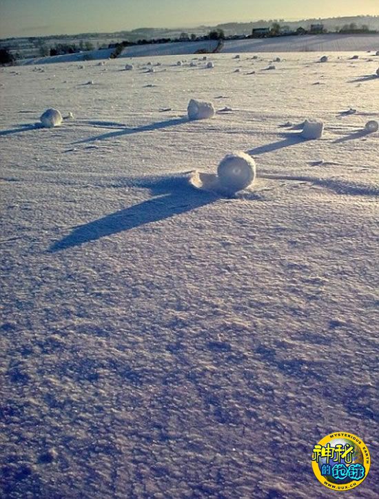 55岁的建筑商罗恩-特利维特(Ron Trevett)及54岁的妻子艾琳一天外出遛狗时,在住宅附近的田野上惊讶地发现了大量雪卷。特利维特夫妇居住在英国萨默塞特郡耶奥威尔(Yeovil)。特利维特说:“我们从远处看到它们在田地高处,心想可能是几个孩子在那玩耍,堆出的大雪球。可走到那里我们才发现周围根本没有脚印,总共有数百个雪卷,孩子们根本不可能堆出这么多。我们意识到一定是大风造就了这种奇特现象。”