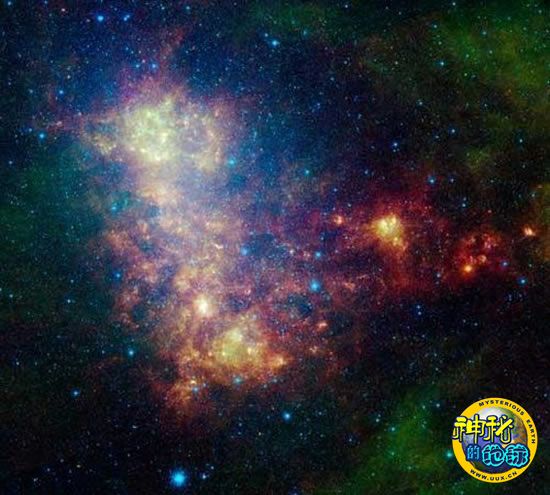 美国宇航局的斯皮策太空望远镜拍到小麦哲伦云附近小星系犹如束状云一般动感十足的照片。