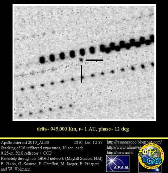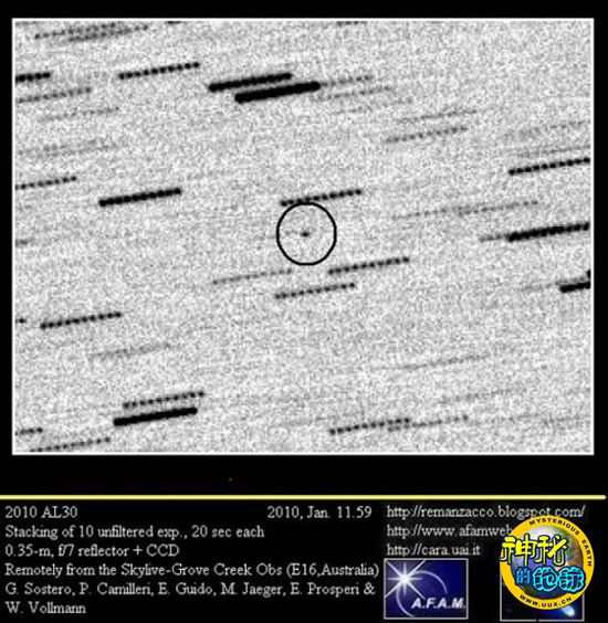 如果想了解这颗小行星与地球的距离究竟有多近,你可以下载由澳地利天文学家杰拉德-唐格尔所制作的“小行星接近地球”动画片段(下载地址为:http://www.dangl.at/2010/2010_al30/2010_al30.avi)。