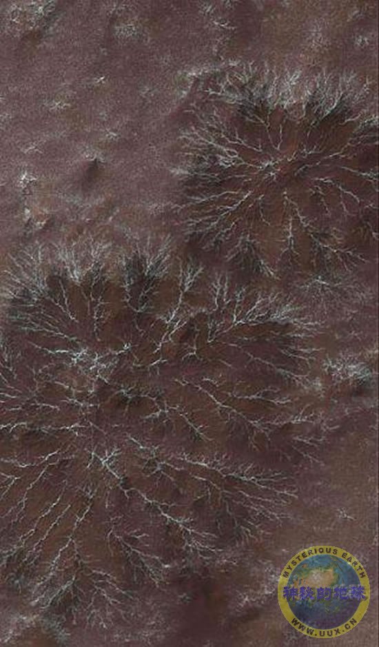 这些与众不同的地貌特征是在火星南极一个被称之为“神秘地带”的区域形成的,之所以说它神秘是因为科学家还很难对其做出解释。在美国地球物理学联合11日举行的一次会议上,科学家公布了宇航局火星侦察卫星新的观测结果。新观测结果为一些有关火星复杂地貌形成的理论提供了支持,这些理论认为,复杂的图案可能是春季时由冻结的二氧化碳形成的极地冰帽下方喷发出的二氧化碳气体“雕刻”的。