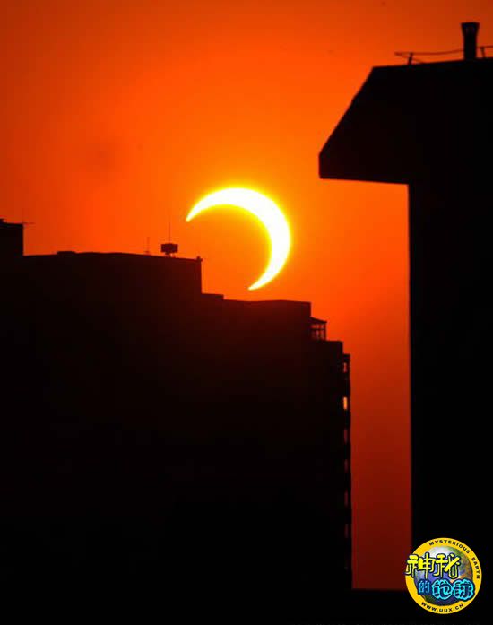 1月15日北京的"带食日落" 来源: 蜘蛛网 时间:2010年1月16日 11:01 1月15日北京的"带食日落" 1月15日在北京宣武区拍摄的"带食日落"景观。当日下午,我国部分地区都观测到日环食天象。由于地理位置原因,北京市可观测日偏食,出现"带食日落"奇观。 新华社记者罗晓光摄 上一篇 下一篇 TAG: 带食日落
