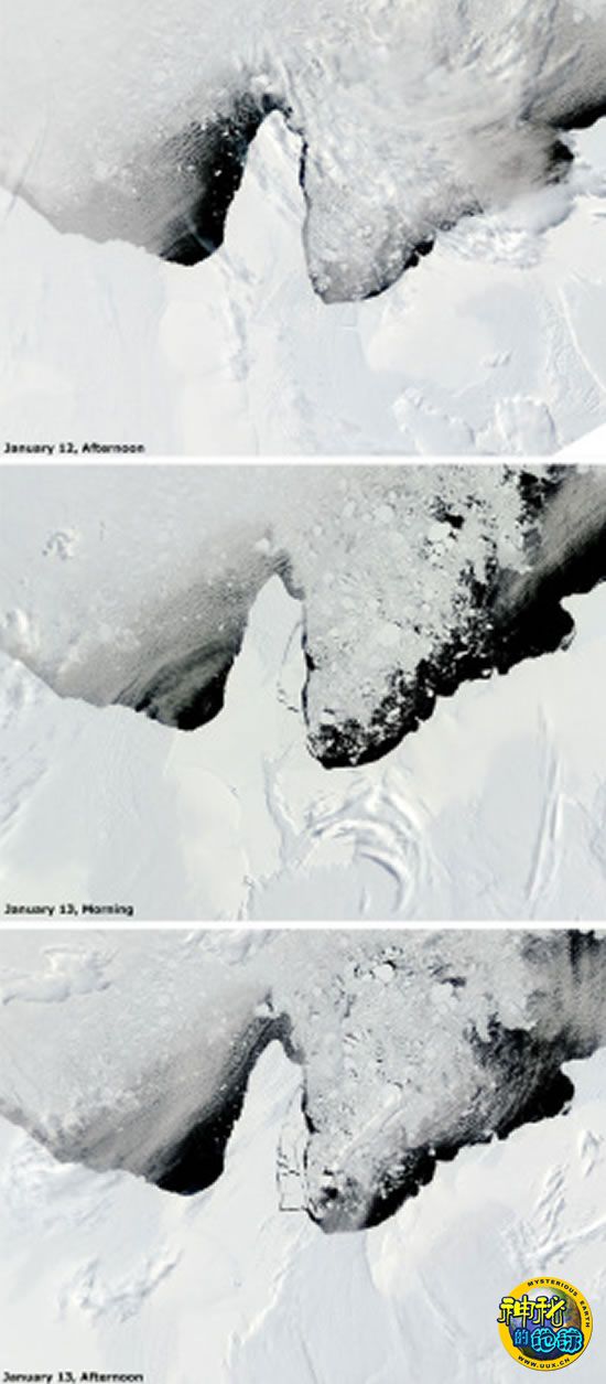 巨型海冰脱离南极龙尼-菲尔希纳冰架的过程。本图显示的分别是1月12日下午、1月13日上午和1月13日下午时的场景。