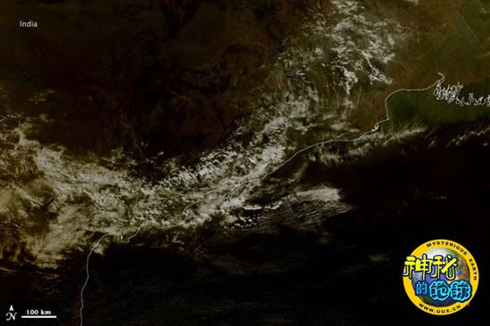 根据美国宇航局Aqua卫星拍下的照片,1月15日的日环食在地球上投下的部分阴影。即便是在阴影最黑暗的部分,云层的反光依旧十分强烈,使得仅有少量阳 光透过月球盘面,照亮其边缘轮廓,但亮度足以让Aqua卫星捕捉到这壮观一幕。再向北,进入印度,即更靠近阴影边缘处,地球表面呈现茶色。白线是添加上去 的,用以勾勒出海岸线的轮廓。